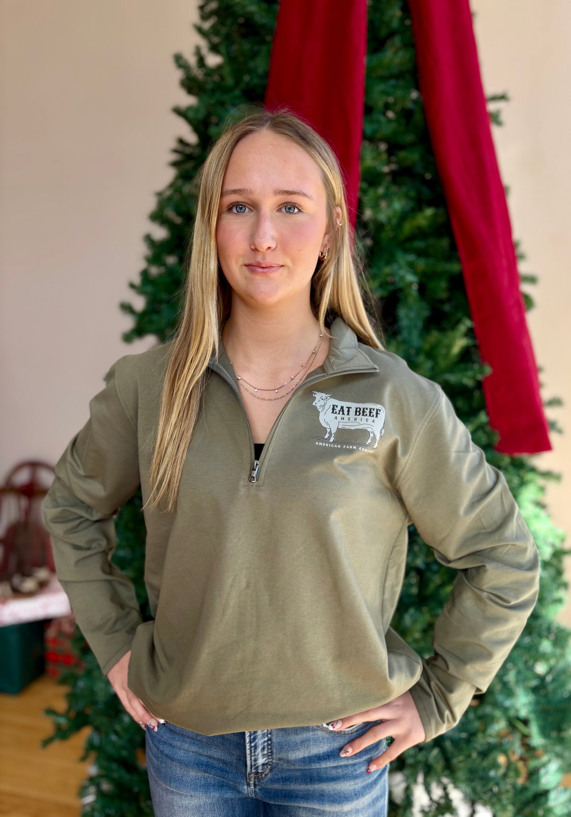 Show your love for farming in style with the AFC Eat Beef Top. Featuring a convenient 1/4 zip and ultra-cozy fabric, this playful piece celebrates farm life while keeping you comfortable from morning to night.