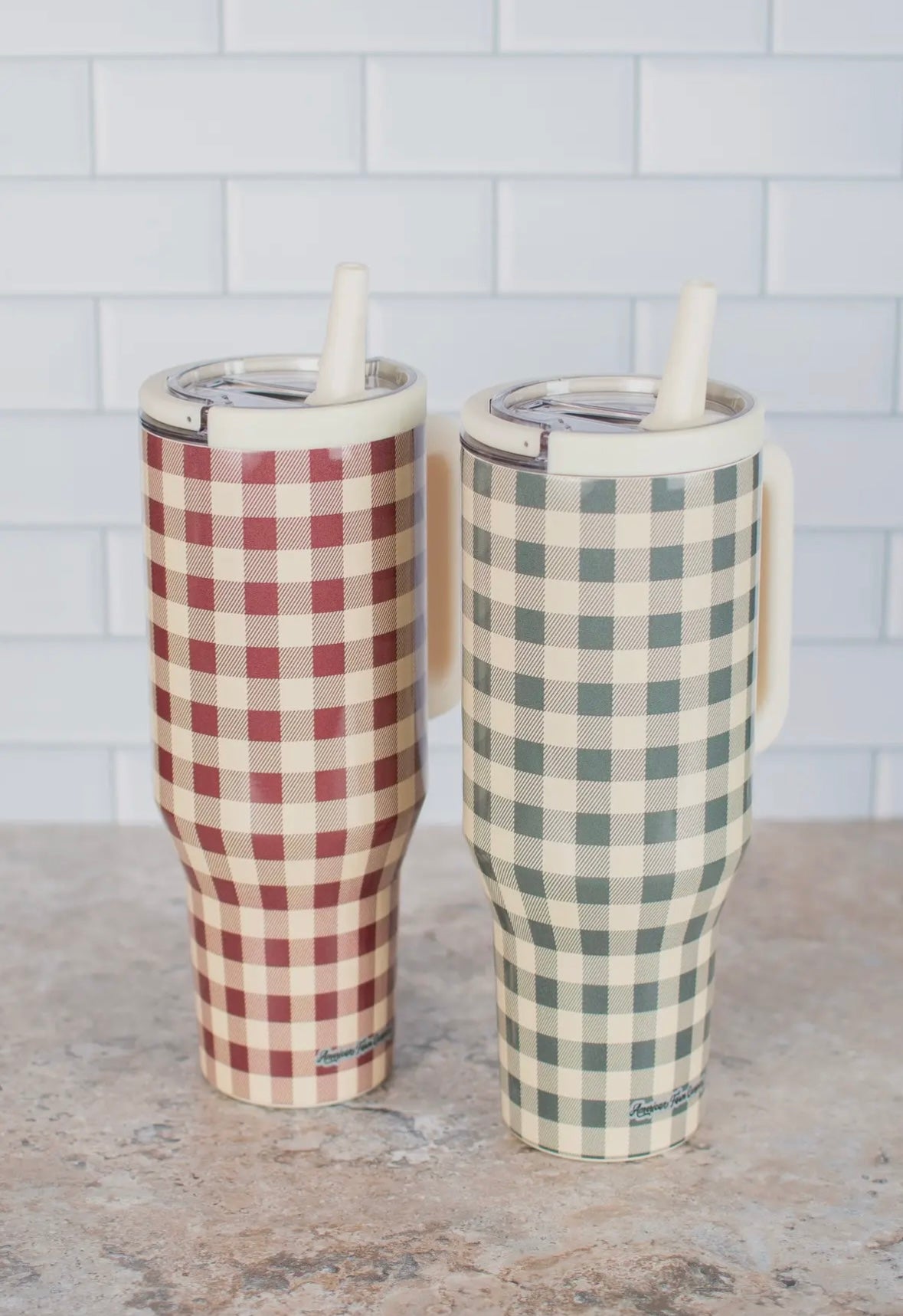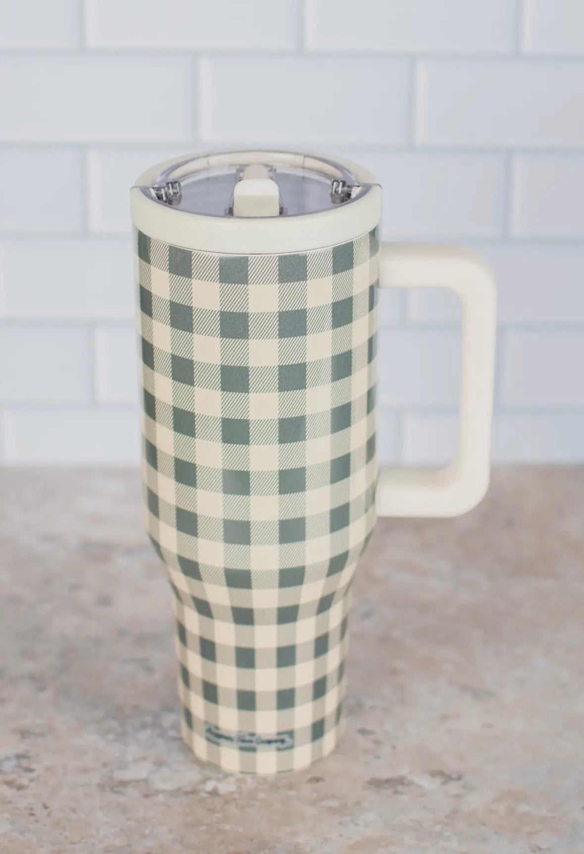 Gingham 40oz Water Tank Tumbler! Featuring a charming gingham design, this insulated stainless steel tumbler keeps your drinks cold or hot for hours. The flip-up handle on the twist-on, leakproof lid makes sipping and carrying a breeze, while its narrow bottom fits perfectly in your cupholder. Whether you’re on the go or relaxing at home, this playful tumbler is the perfect companion for every adventure.