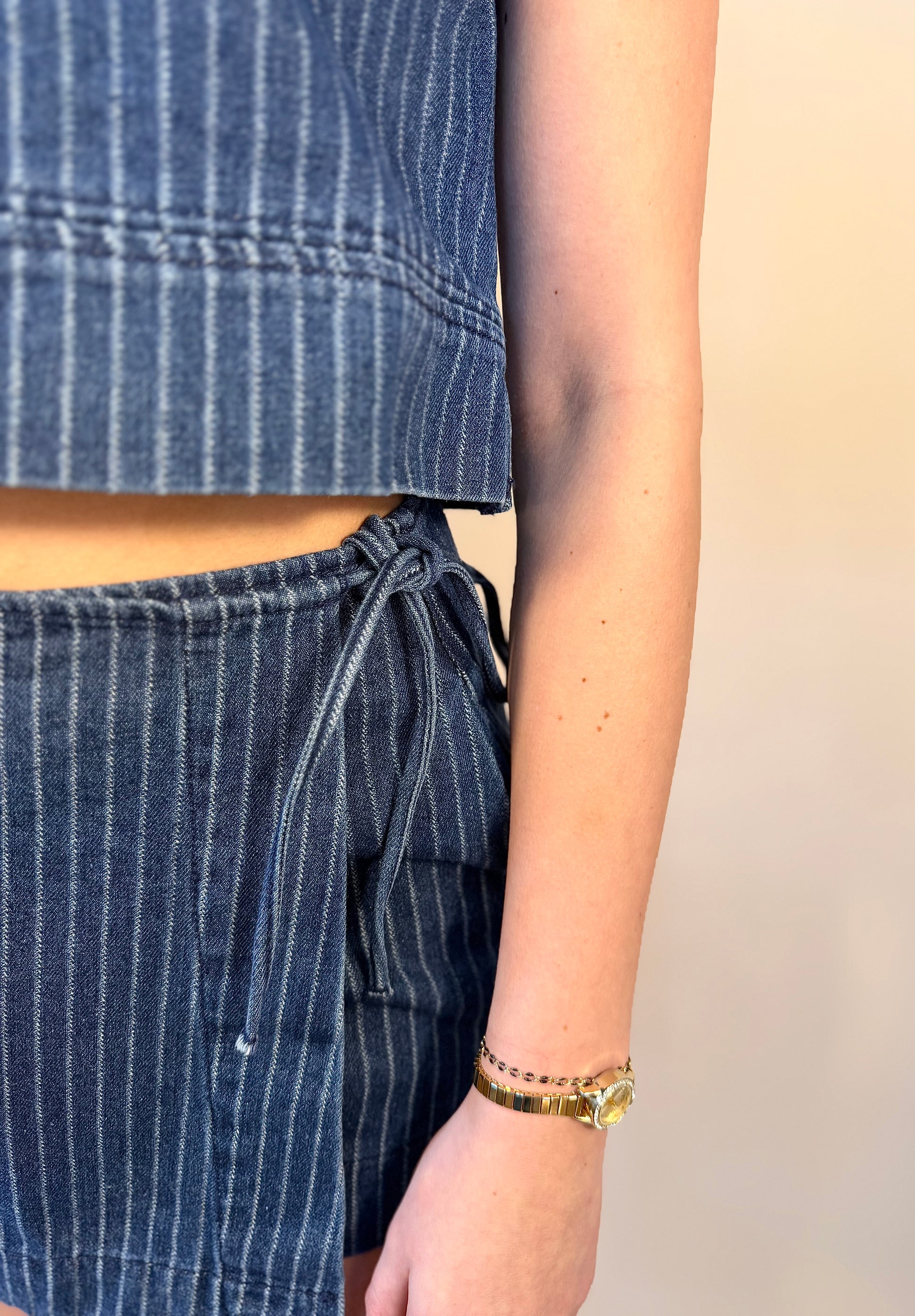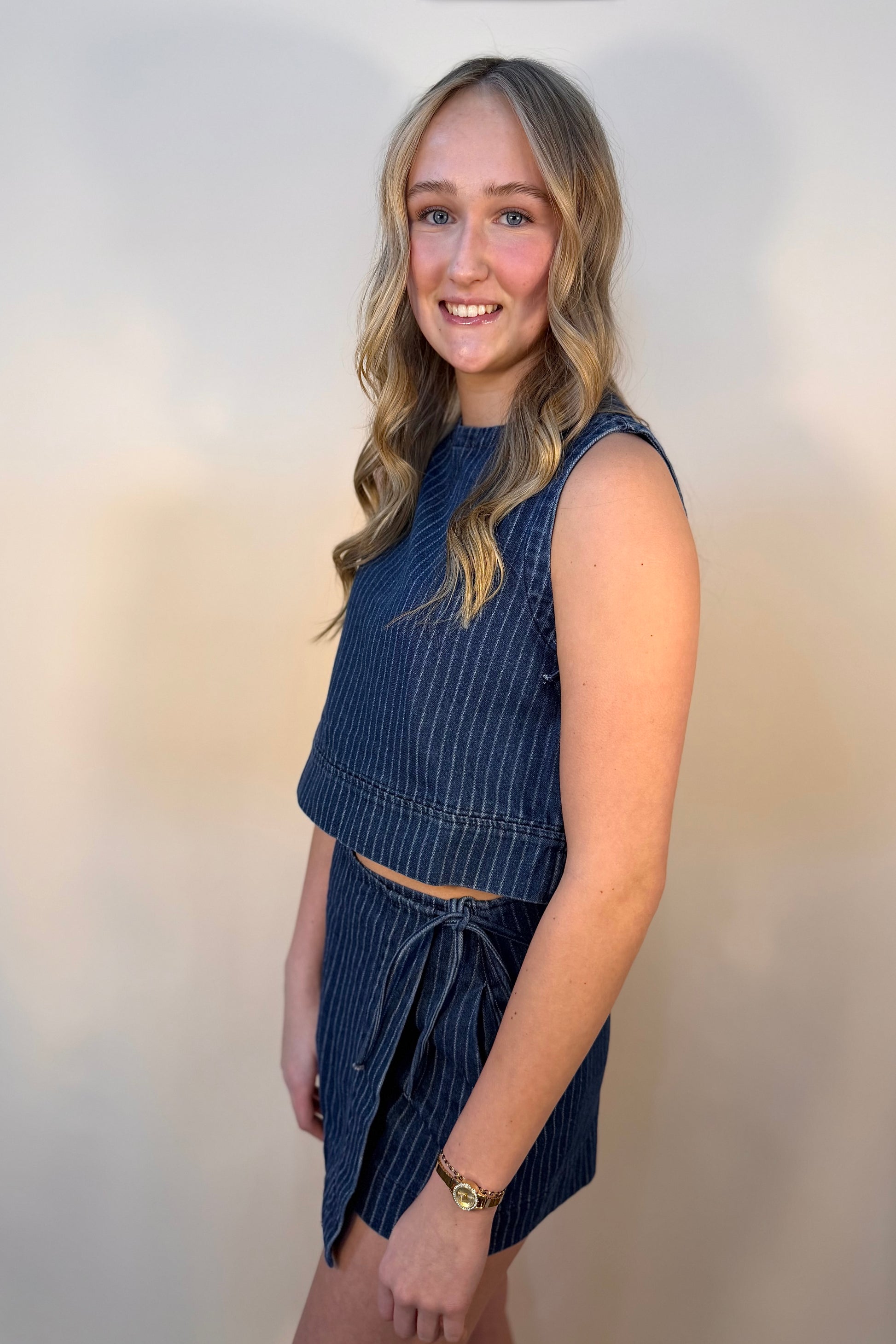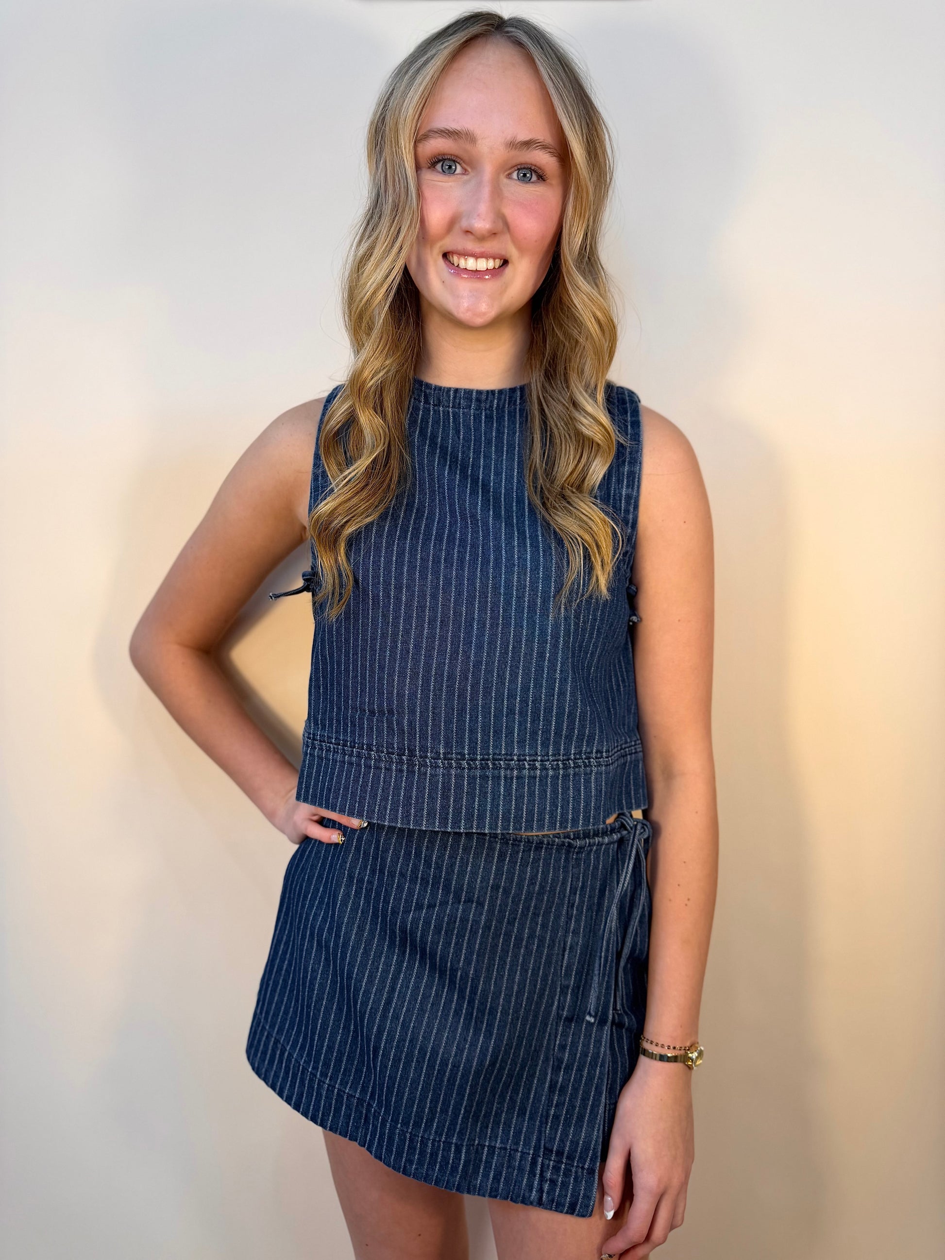 The Ariana Skort is a coordinated denim set that brings together thoughtful details and modern style. The tank features a button closure on the back for easy layering and adjustability, while the matching skort showcases a charming side bow tie and pinstriped accents. Choose between the zip-up or traditional skort style to match your mood. This versatile set works beautifully as a complete look or lets you mix pieces with other favorites in your wardrobe. Perfect for anyone who loves denim with personality and practical design touches.