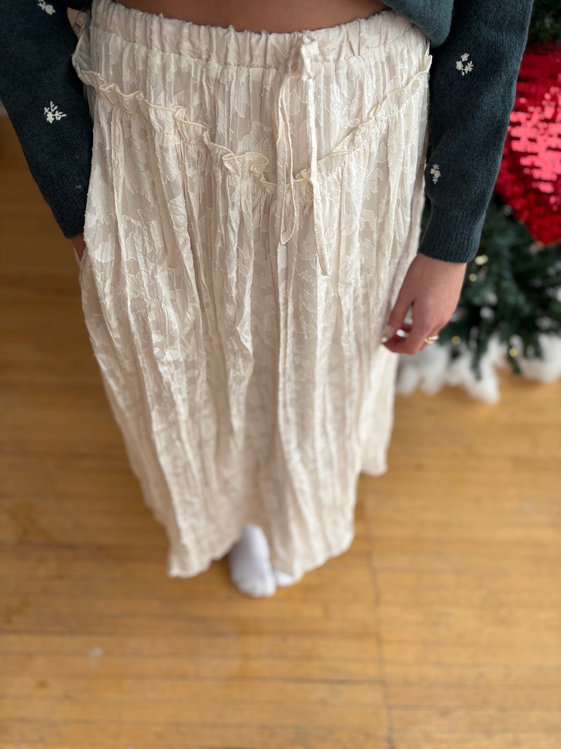 Features a semi-sheer floral burnout texture for a romantic, vintage-inspired look - Relaxed Maxi Silhouette: Flowy A-line cut drapes beautifully for easy, graceful movement - Ruffle Trim Waistband: Soft ruffle detail along the waist adds a feminine, whimsical touch - Elastic Waist with Drawstring: Stretch waistband with adjustable tie ensures a comfortable, flexible fit - Functional Side Pockets: Discreet side pockets add everyday convenience without disrupting the silhouette - Fully Lined: Includes a full lining for comfortable coverage and worry-free wear