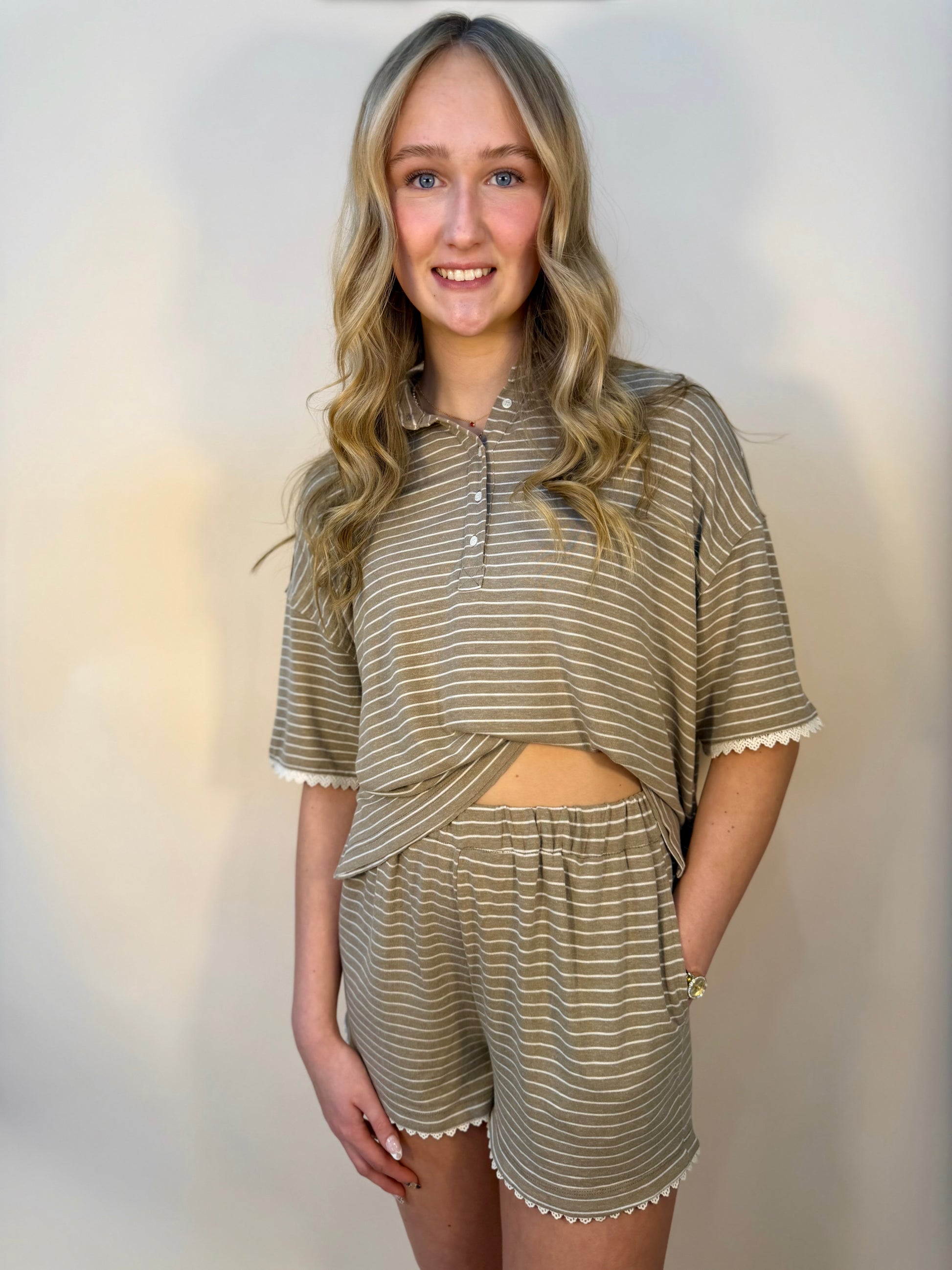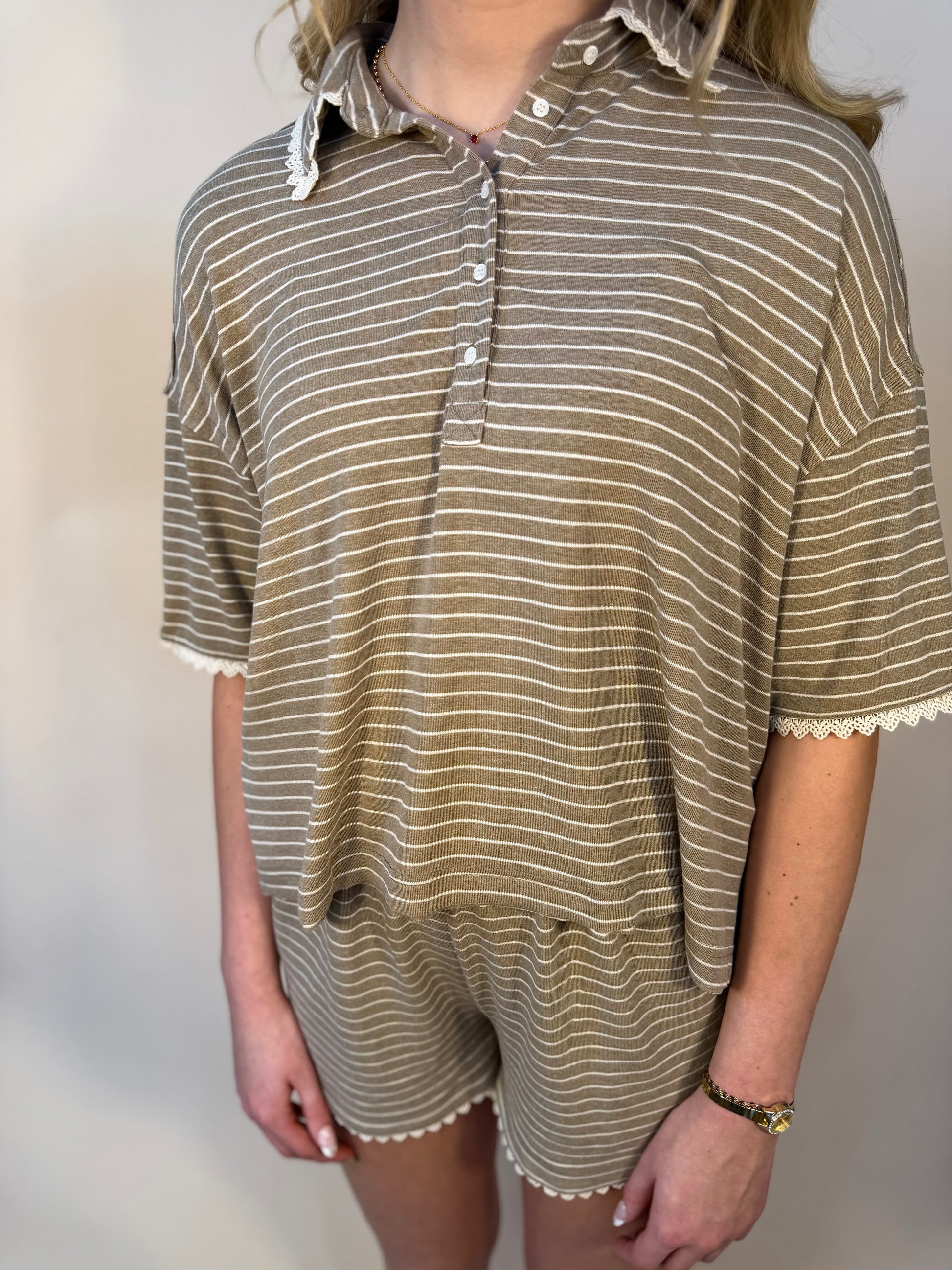 Comfy striped polo + shorts set featuring: Shirt: - Functional buttons - Scalloped lace trim edges - Raw edge hem detail Shorts: - Elastic waistband - Scalloped lace trim edges