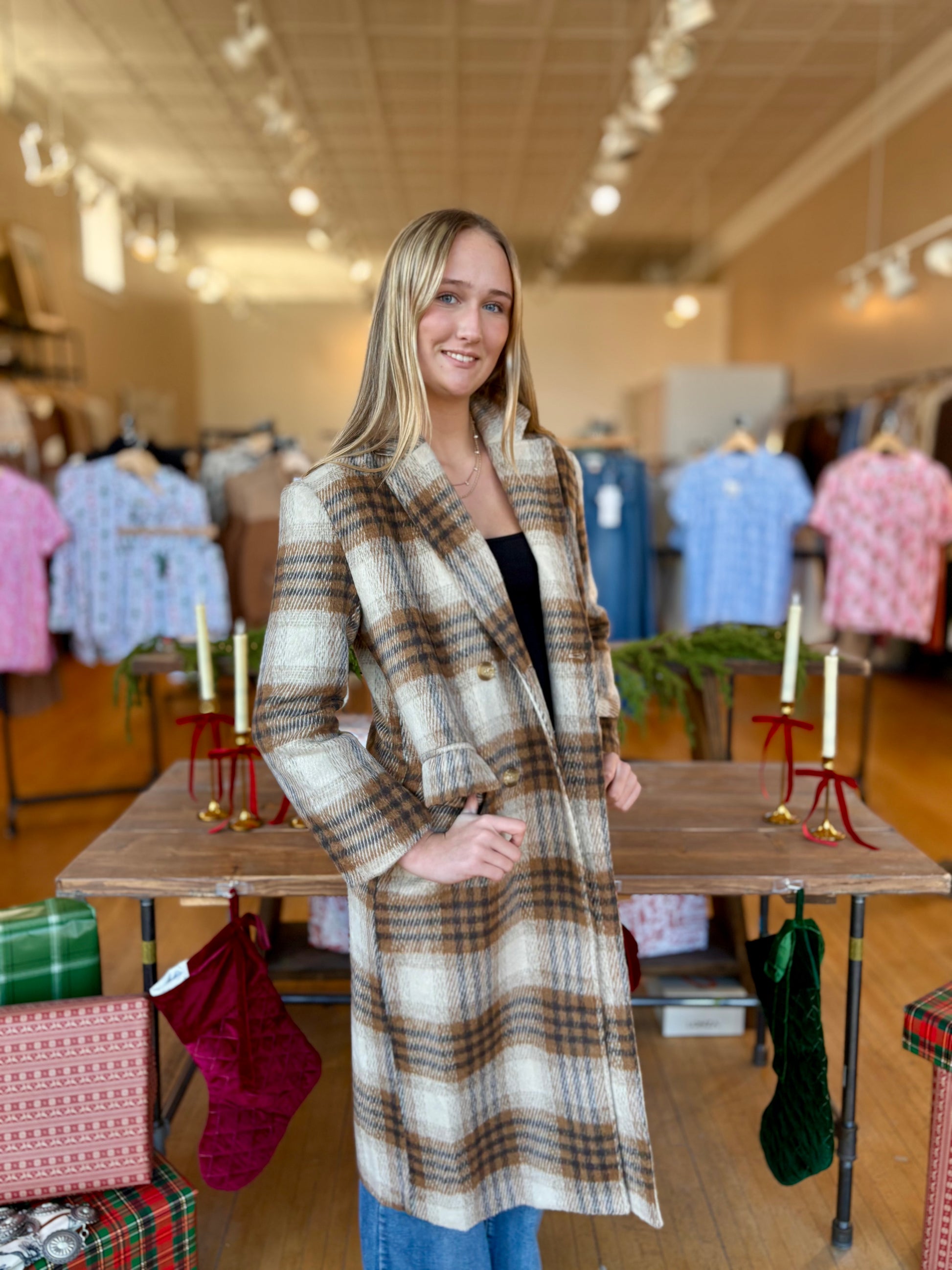The Layla Longline Coat combines the timeless charm of neutral tones with a classic plaid pattern, creating a versatile piece that elevates any outfit. Its longline design offers both warmth and a flattering silhouette, making it perfect for chic, everyday wear. Embrace effortless style and cozy comfort with this cute and stylish coat that complements any wardrobe.