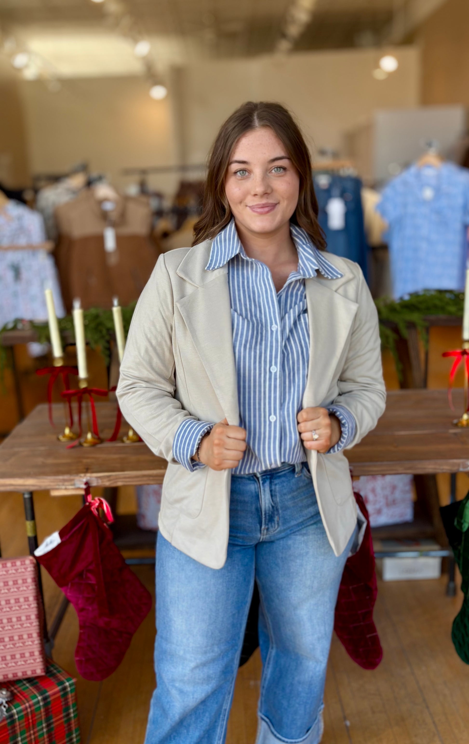 Introducing the Mallory Blazer—your new secret weapon for looking polished without trying too hard. This cream-colored stunner is crafted from luxuriously soft fabric that feels as good as it looks. Whether you're dressing up a casual outfit or layering over your favorite dress, the Mallory works overtime to keep you looking chic and feeling comfortable all day long.