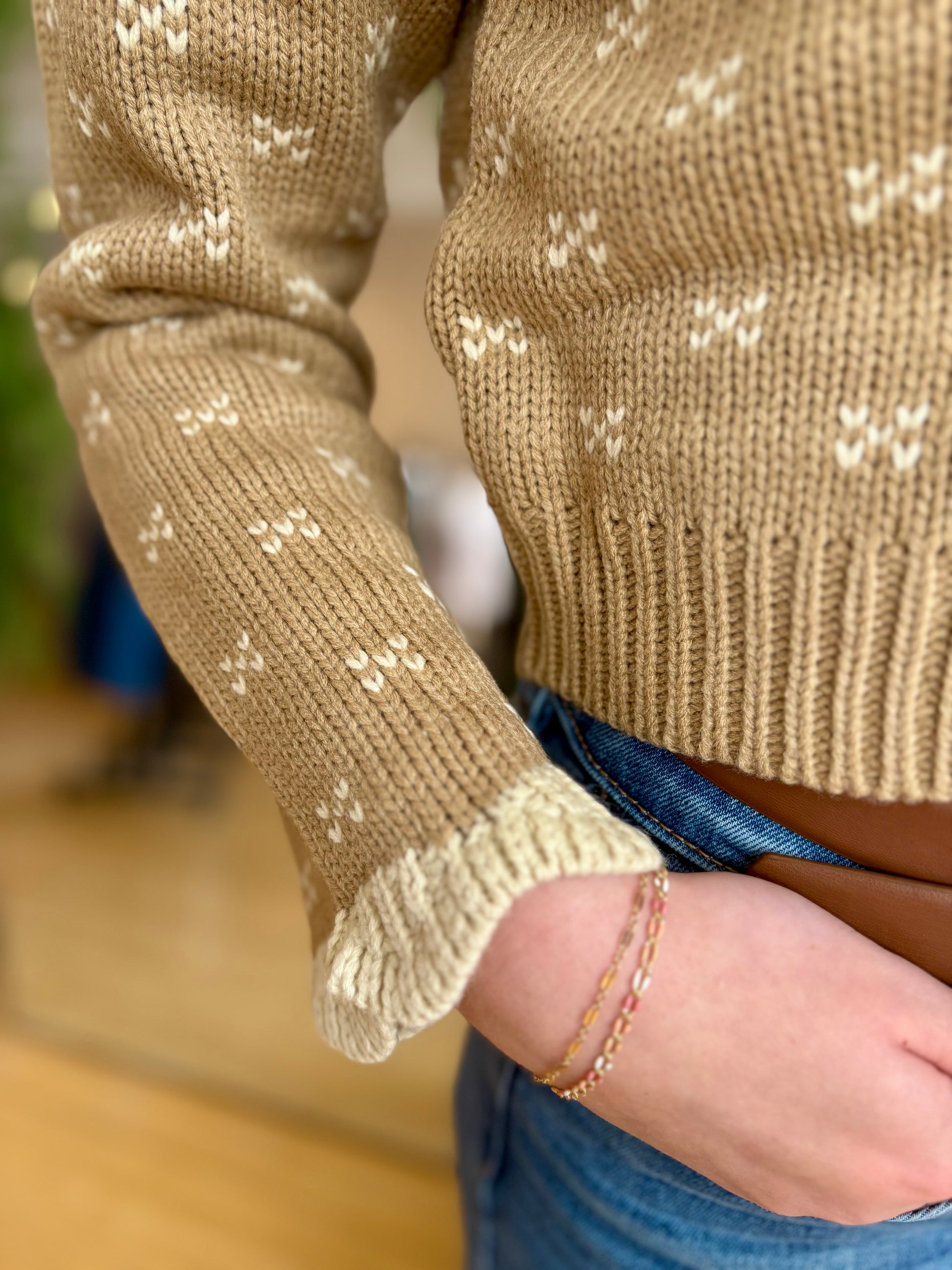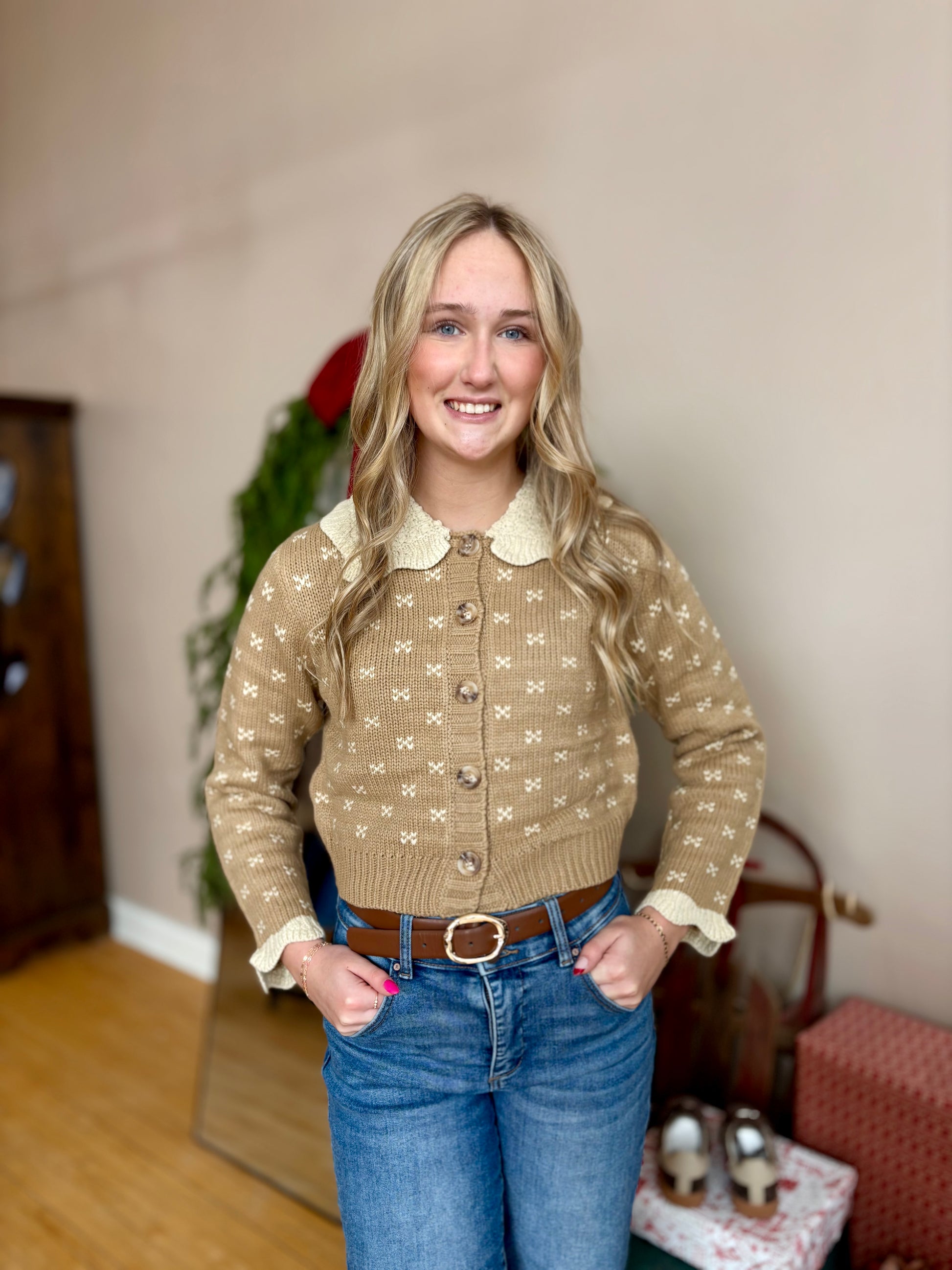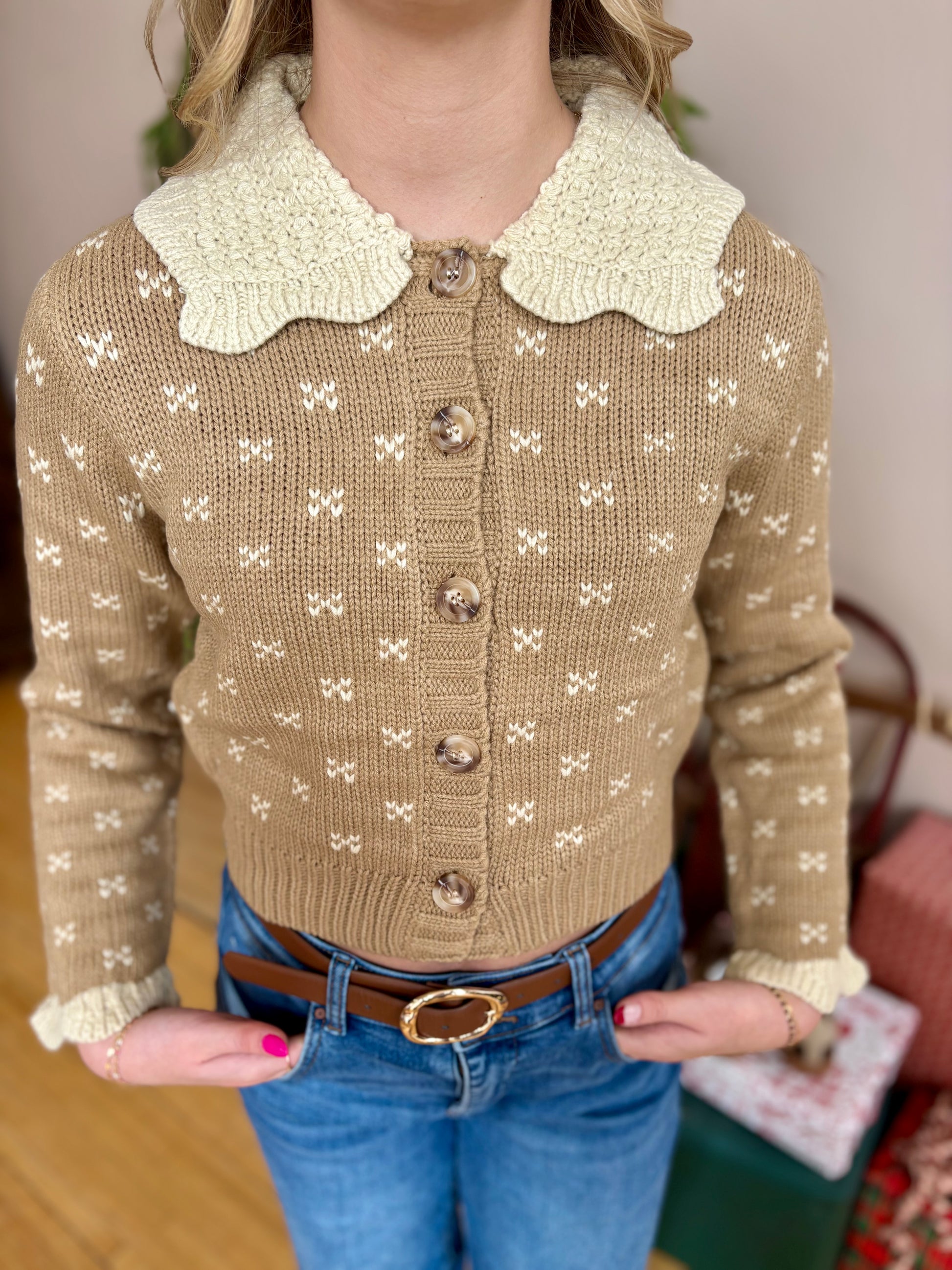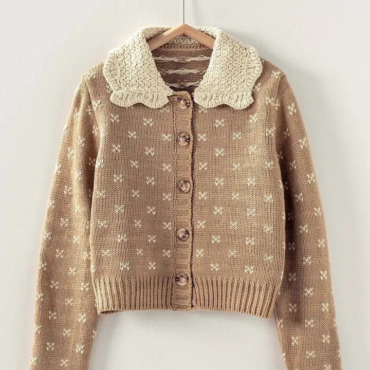 Add a touch of vintage charm to your wardrobe with this patterned knit cardigan. Featuring a sweet ruffle collar and matching cuffs, the button-front design is crafted from soft acrylic, offering a cozy yet feminine layer perfect for pairing with high-waisted denim.