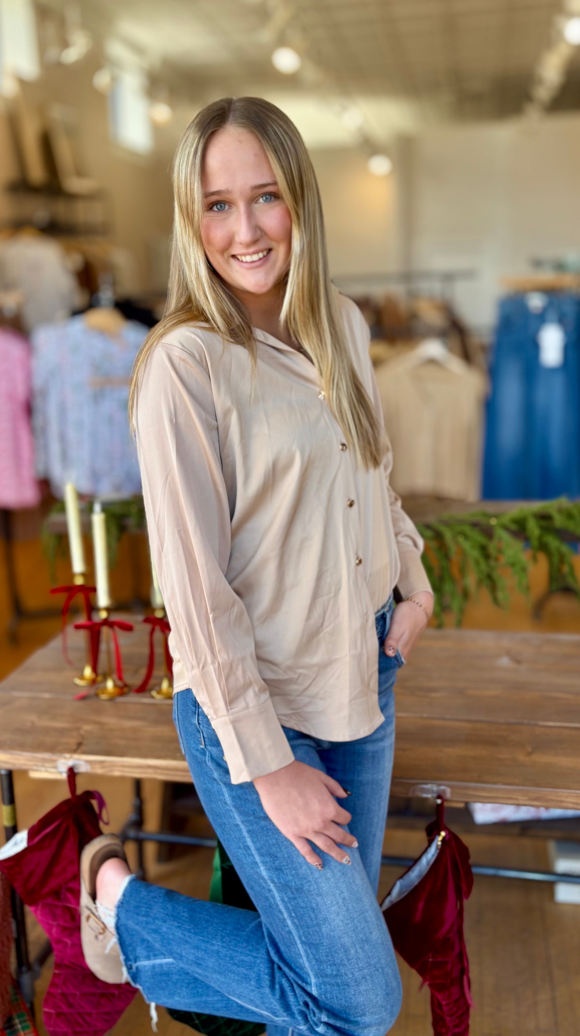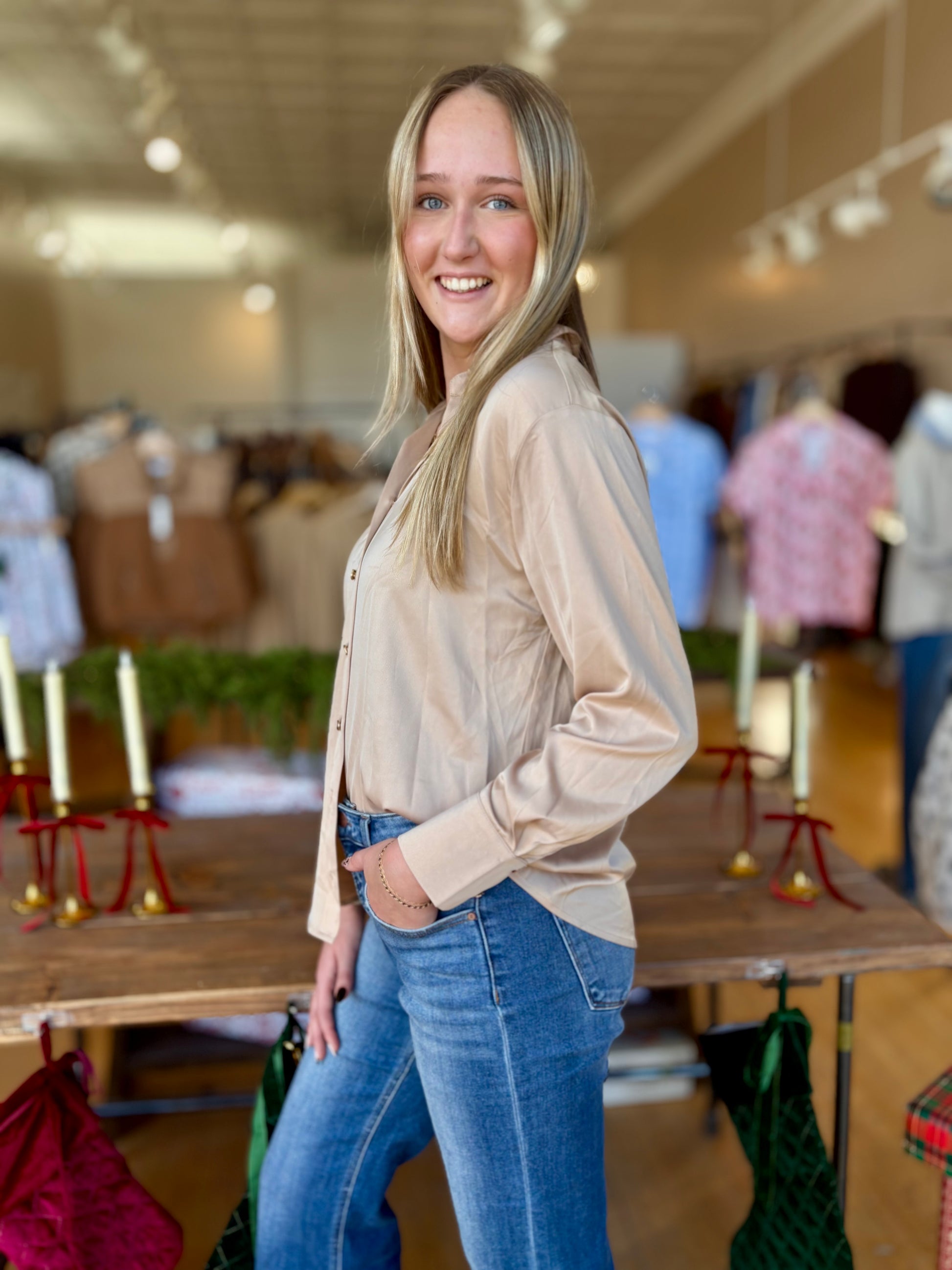 Introducing the Tally Satin Top—where luxury meets playful style! This stunning piece features gleaming gold buttons that add a touch of glamour and sophistication. The silky satin fabric drapes beautifully, creating an elegant silhouette that works for both special occasions and elevated everyday wear. Shine bright in this showstopping top!