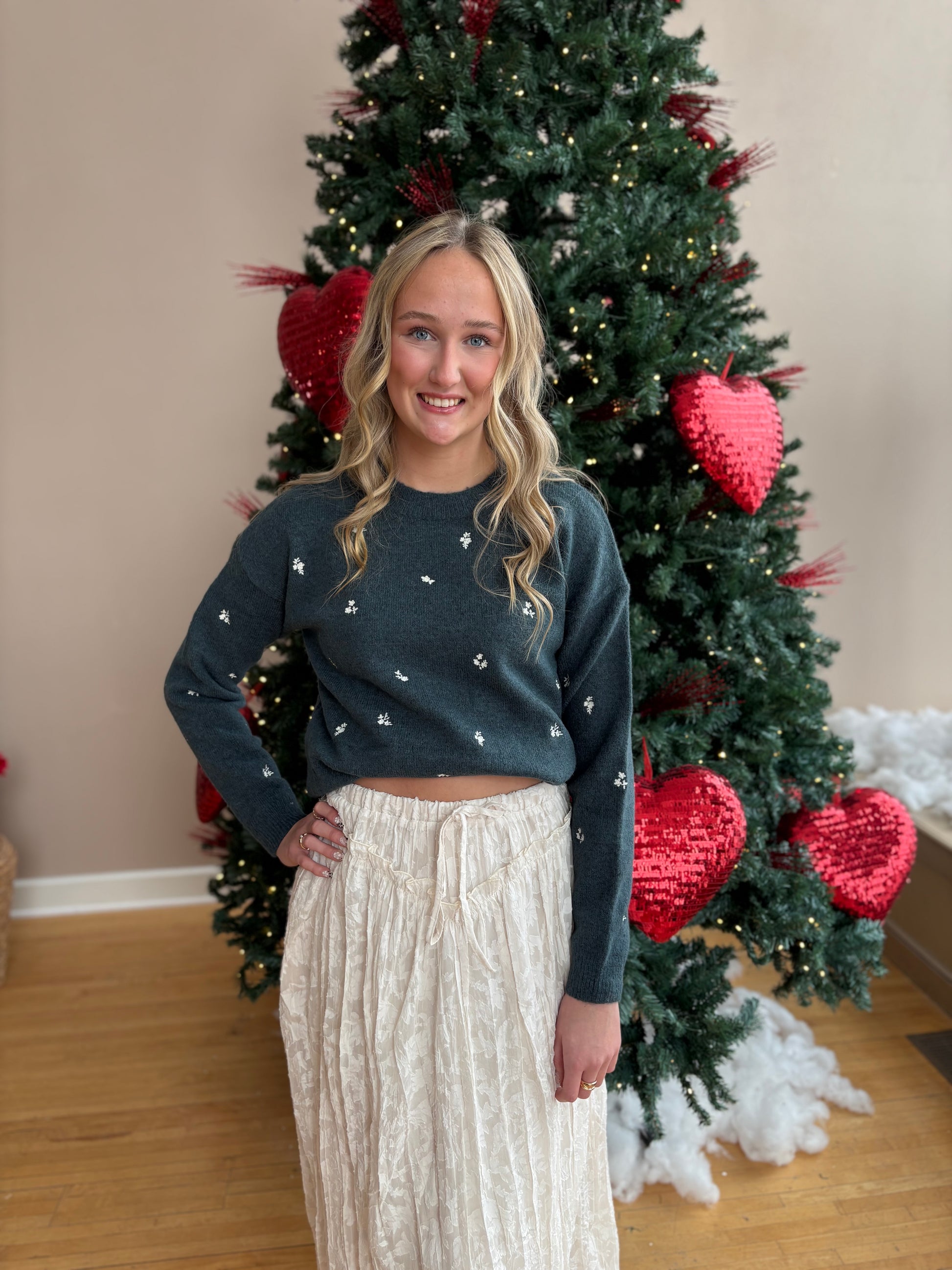 - Soft Knit Fabric: Plush and cozy texture ideal for cooler days - Delicate Embroidery: Small white floral-like embroidered dots throughout - Classic Crew Neck: Clean neckline for versatile styling - Relaxed Fit: Comfortable silhouette with dropped shoulders - Ribbed Trim: Rib-knit at cuffs, hem, and neckline for added structure